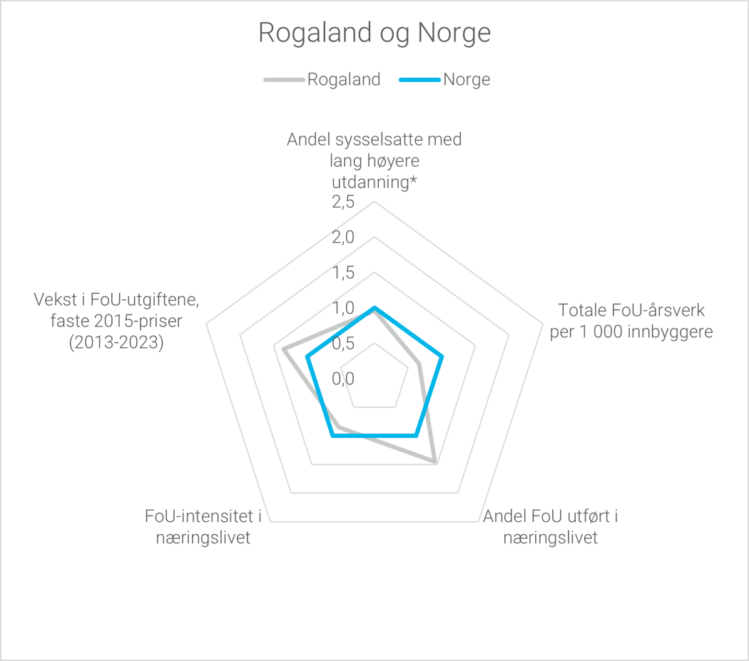 Oslo er fortsatt det største fylket målt i FoU-aktivitet, og står for nær en tredjedel av FoU-utgiftene i Norge. I Oslo er det et FoU-intensivt næringsliv, særlig innenfor tjenesteytende næringer, som står for den største andelen. Men også universitets- og høgskolesektoren, som også inkluderer Oslo universitetssykehus HF, har en stor andel FoU i Oslo. Universitetet i Oslo og andre store utdanningsinstitusjoner som OsloMet og Handelshøyskolen BI bidrar til den høye andelen. I alt 7 vitenskapelige høgskoler og 4 andre høgskoler, av totalt 23 høgskoler som inngår i universitets- og høgskolesektoren, er lokalisert i Oslo. I instituttsektoren er det særlig SINTEF, Norges geotekniske institutt, Norsk institutt for vannforskning og Folkehelseinstituttet som bidrar til den høye FoU-aktiviteten i hovedstaden.