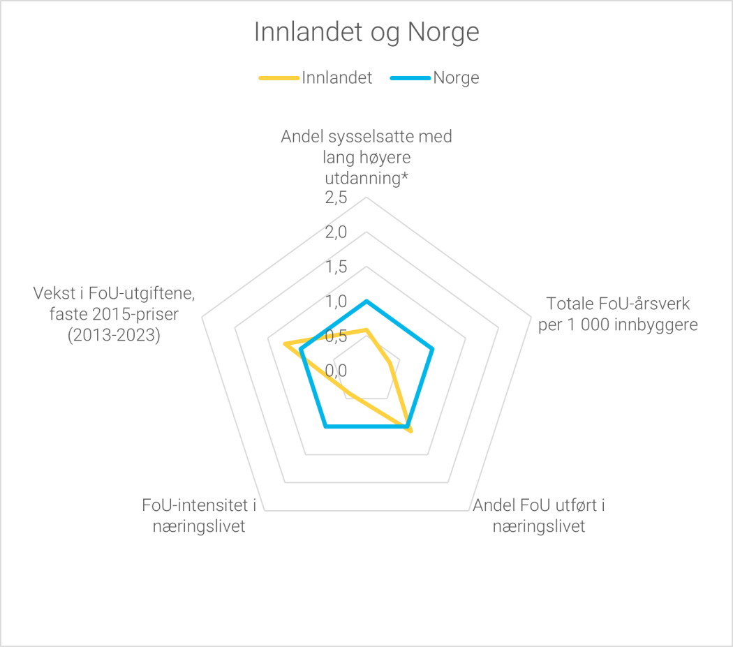 FoU-aktiviteten er ikke like høy i alle fylker i Norge. Nordland, Innlandet og Møre og Romsdal er fylkene med lavest andel av Norges samlede FoU-aktivitet. Alle disse fylkene hadde en andel på om lag 2 prosent hver av den samlede FoU-aktiviteten i Norge i 2023. Figur 1.6b viser også at disse tre fylkene, sammen med Agder, har lavest FoU-aktivitet målt i FoU-utgifter per innbygger.
