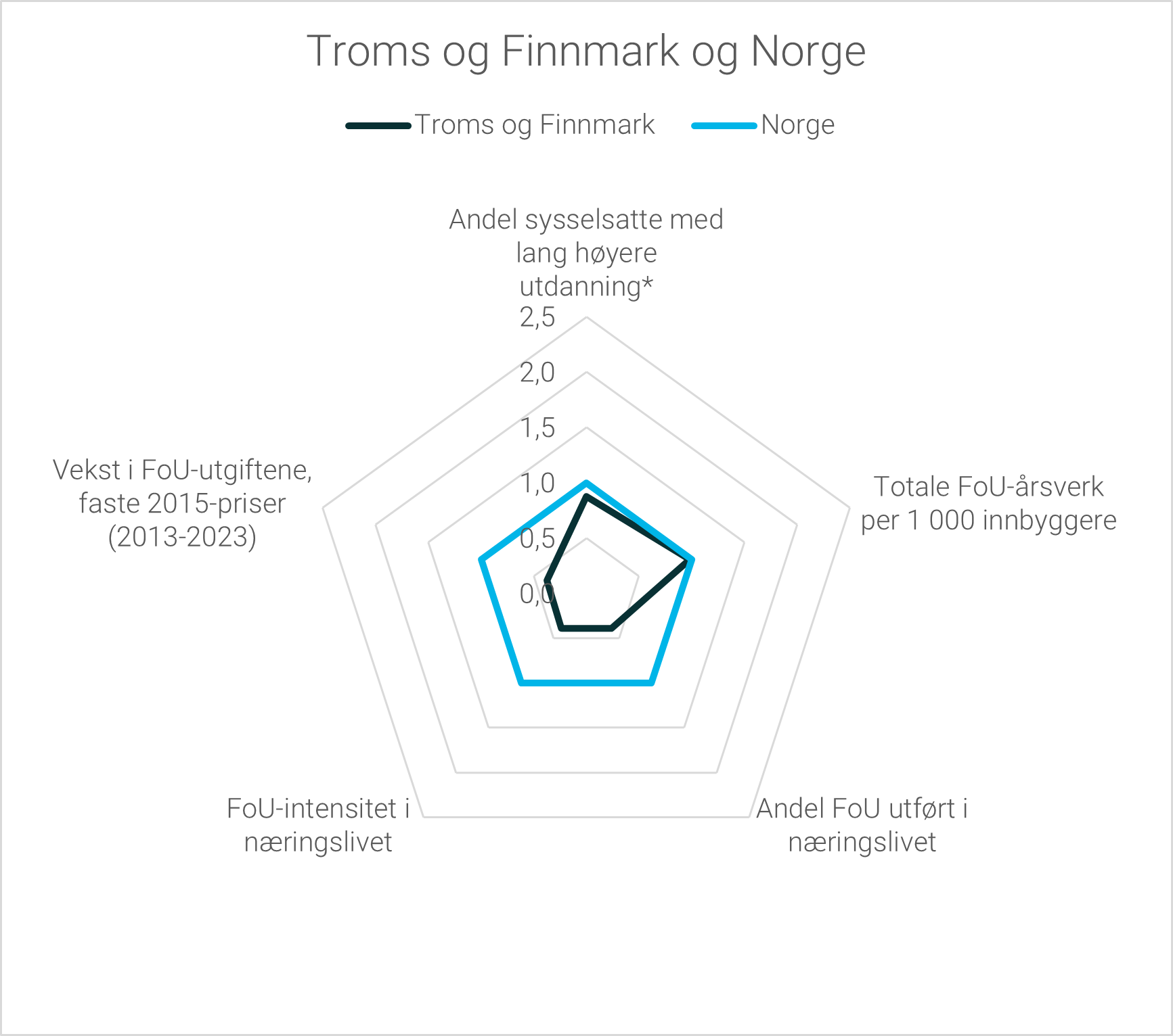 Selv om Troms og Finnmark ligger et stykke bak de 4 største fylkene målt i totale FoU-utgifter har vårt nordligste fylke en høy andel FoU-utgifter per innbygger. Her har lokaliseringen av UiT – Norges arktiske universitet og Universitetssykehuset i Nord-Norge stor betydning for den høye andelen.