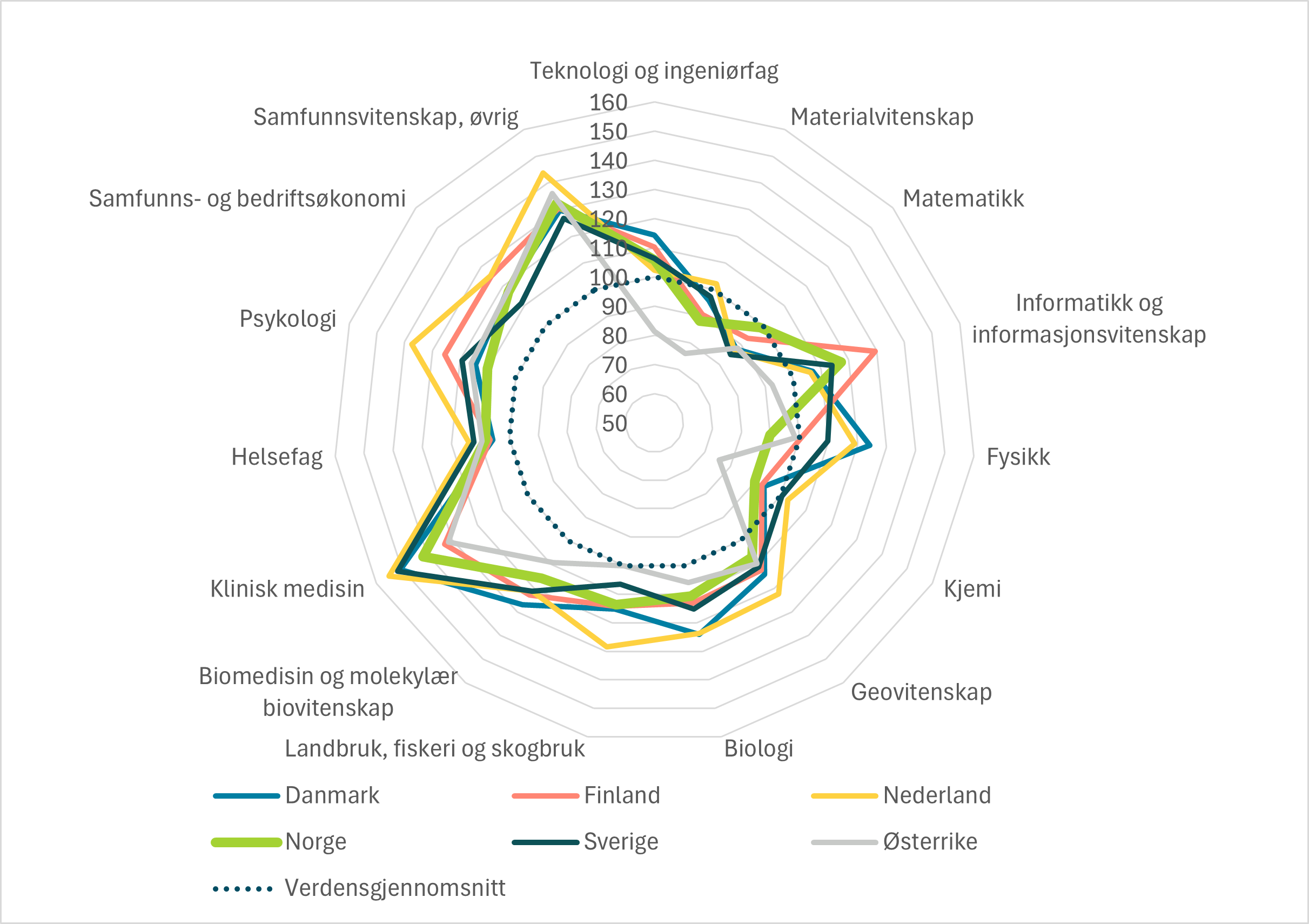 Norge har spesielt få publikasjoner innen kjemi og materialvitenskap, der spesialiseringsindeksen vår er sterk negativ (-0,43 i begge fag). Situasjonen for kjemi er også omtalt som bekymringsfull i den siste evalueringen av naturvitenskap i Norge. Men også i biomedisin og molekylær biovitenskap, fysikk, matematikk og teknologi og ingeniørfag, er spesialiseringsindeksen klart negativ (i intervallet -0,14 til -0,19). Innenfor fire fagfelt (humaniora, informatikk og informasjonsvitenskap, klinisk medisin og landbruk, fiskeri og skogbruk [2]) avviker ikke Norges spesialisering spesielt fra verdensgjennomsnittet.